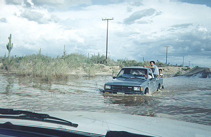 When these holes dry up the local government sends out 10 guys with shovels to clear the mud, dirt and rocks left over from the flood. This is good. What is bad is that state of the art highway markers in Baja consist of a single orange cone placed about 3 feet ahead of where the workers are. This is not a problem unless there is a rise in the road just before the "vado", and youre driving an overloaded sport utility. This adds great excitement to the drive home, as does the "Datsun Truck Driver". Somewhere, nestled deep in the mountains of Baja, there is a heavily guarded chain link enclosure. Razor wire tops the fences, and well armed sentries peer suspiciously from elevated gun towers. It is here that the Mexican government develops their surreptitious bio tech industry. It is here that they clone the "Datsun Truck Driver". On the road between Vizciano and Guerrero Negro you will, with alarming regularity, find yourself on the highway behind a painfully slow, beat up, and dusty Datsun mini pickup. Never a Toyota, Chevy, or other truck. Always a Datsun. You will invariably be stuck behind them on a tight, winding stretch of road, full of blind corners. The speed of these trucks never exceeds 25 MPH. It will take you several minutes before you finally can pass them. After the fifth truck it suddenly occurred to me that the same person