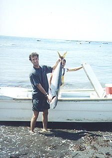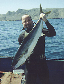 We hit a couple of spots, including the famous "240", a pinnacle that rises up from several thousand feet to less that 2 feet below the surface. Scary for boat owners, but its an absolutely awesome dive, and I wish I was in better shape to enjoy it. The vis is somewhat limited, but there is plenty of activity, including the biggest "wall" of yellowtail Ive seen. I had made a 40 foot dive, hung out for a while and began to surface. Just before hitting air, I looked down to see Kelly gliding to the bottom, where he is swarmed by 50-60 yellowtail in the 20 pound range, who were following me up. They bend in unison as they approach him, veering back into the haze. Kelly has recently seen marlin, tuna, and dodos in this spot, but our luck is not as good this day. Nate shoots one tail, I catch a small yellowfin providing some evidence of our trip for the dinner table back home. I spend a few minutes hovering next to a huge mola mola, tucked in next to an outcropping. Its a place with great potential. We will be back. Many hours later we find ourselves being waved through customs, (my border crossing karma finally reverses) and as we return to the states a sense of both happiness and melancholy hit me. Im glad to be going home to see my wife and dogs, to be able to get a milkshake and a burger, a clean bed, and a some cool (er) weather. But not too far in the back of my mind is amazing, warm water, teeming