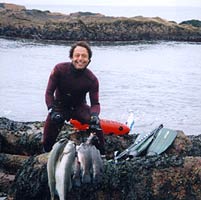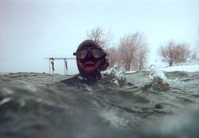 vers la surface ! (3) Quelle bataille particulière va-t-elle me livrer? Malgré la lutte, je suis maintenant presque saturé de dioxyde de carbone et il me faut amorcer ma remontée. Me propulsant hors de l'eau comme une bouée relâchée du fond, j'agrippe ma belle prise après une apnée d'une minute 20 secondes et me laisse emporter par le courant qui me ramènera vers la rive. Par cette chaude journée à Valleyfield, il serait mieux de placer le poisson dans ma glacière au plus tôt. Deux minutes plus tard, je chevauche le courant en direction de la 'Machine à Laver' et la chasse continue. L'effort physique, déployé durant les 3 à 5 heures qui suivront, est tellement intense, que je perds plus de 2 kilos de poids, dont la moitié en eau. De tous les sports que je pratique, aucun ne pourra plus me rassasier. La chasse sous-marine en apnée n'est pas juste un sport extrême; c'est une passion un mode de vie. 1- Causée par les eaux tumultueuses en aval du barrage, l'écume est trop légère pour permettre une flottaison et en conséquence, toute respiration. 2- Un surnom que des apnéistes du Grand Montréal donnent à cet endroit en particulier, à cause des courants, vagues écumantes et tourbillon de surface. 3- Tous les poissons, une fois atteints, tenteront de se dégager en nageant vers le fond, à l'horizontale, ou essayeront de se cacher dans les rochers. Le site personnel de M. Yazbeck vous informera davantage sur son parcours de chasseur sous-marin et ses aventures. |